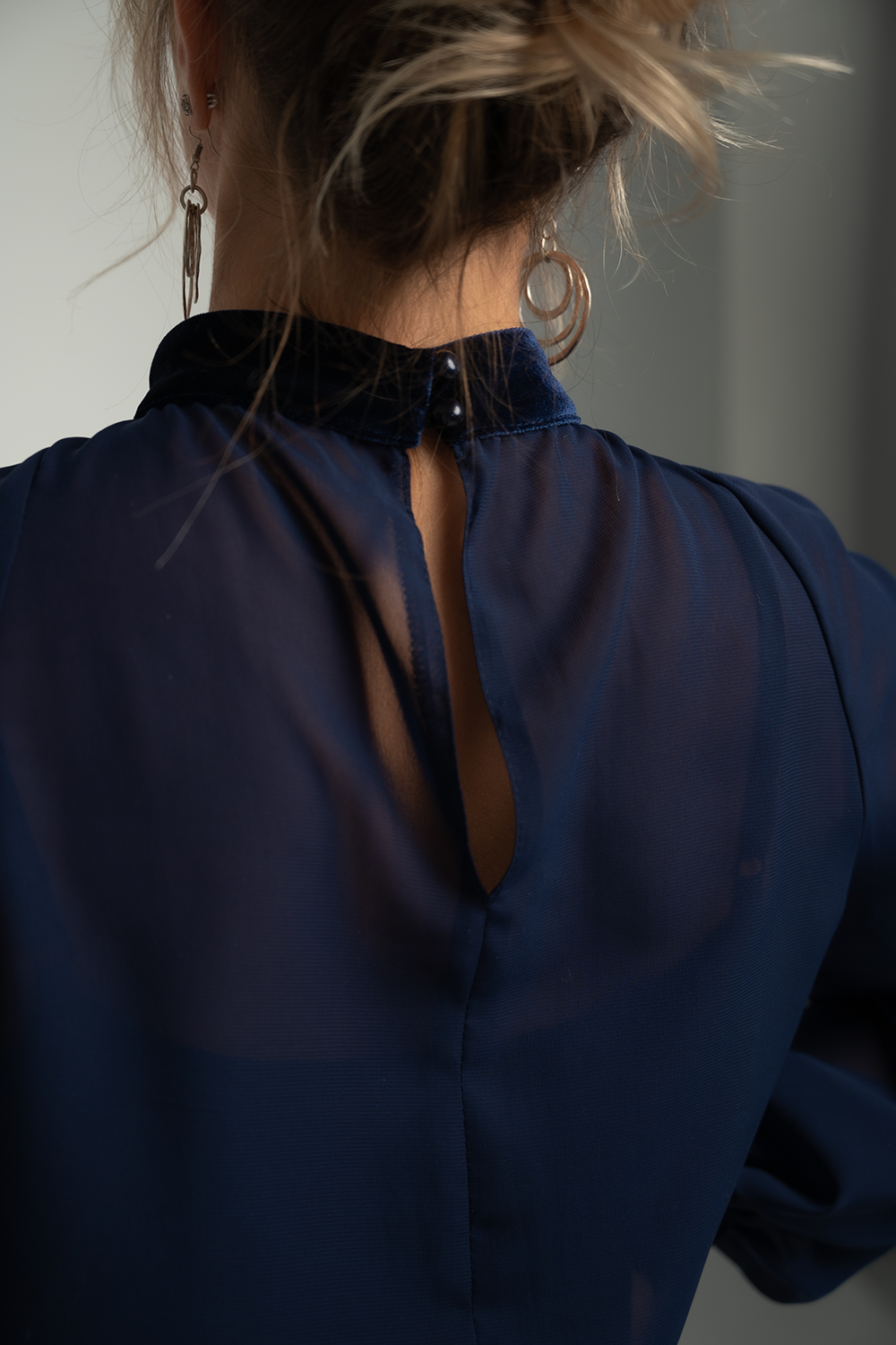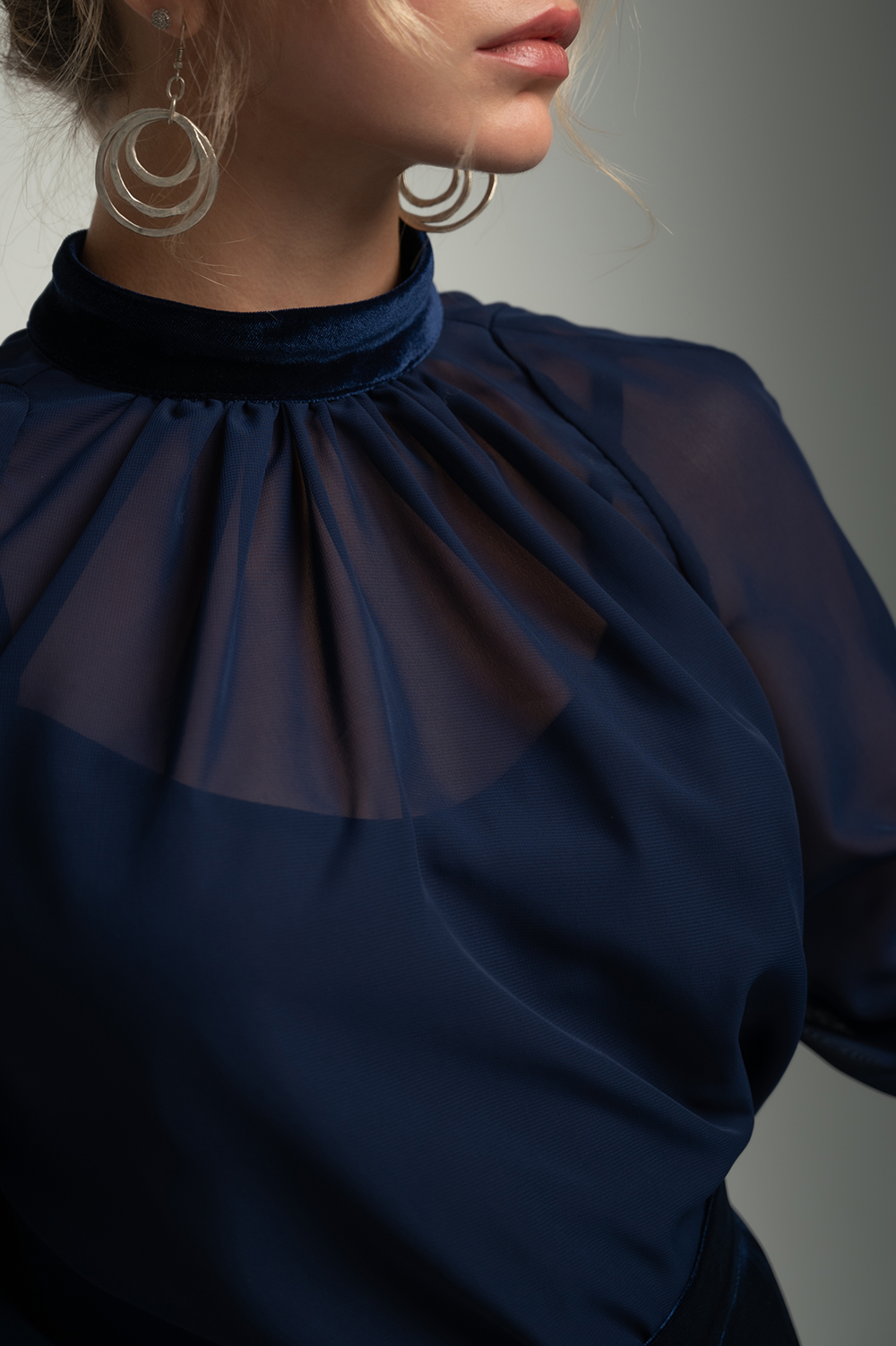The blouse drapes softly over the body, adding lightness and air to the look.