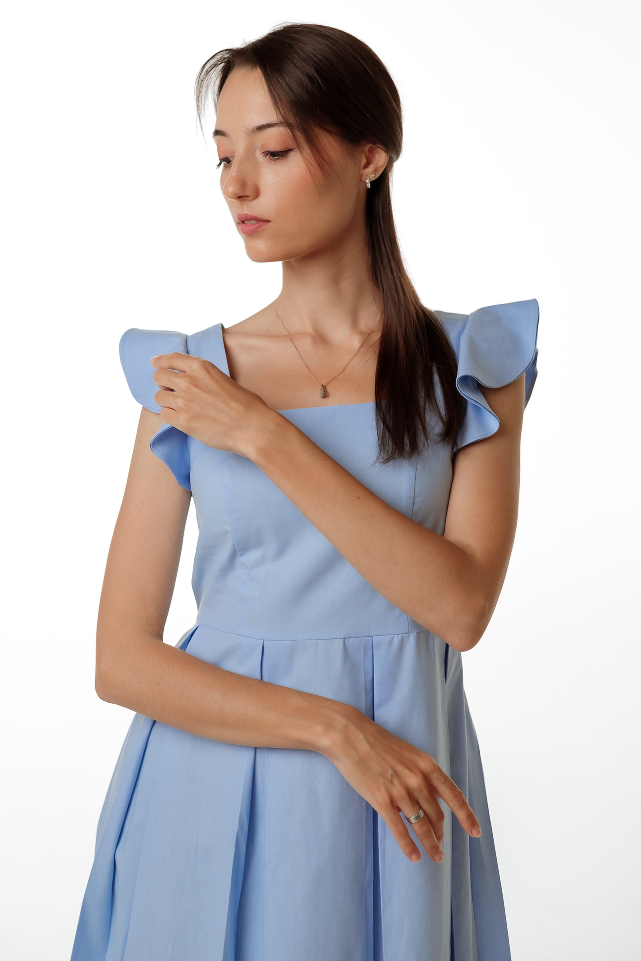 Lagana i prozračna, ova haljina izrađena od prirodnog pamučnog poplina savršen je izbor za ljeto. Uski gornji dio s četvrtastim izrezom ističe ključne kosti, dok dvostruki nabrani rukavi dodaju elegantan dodir volumena. Suknja A-kroja s naborima lagano se širi, stvarajući gracioznu i ženstvenu siluetu.