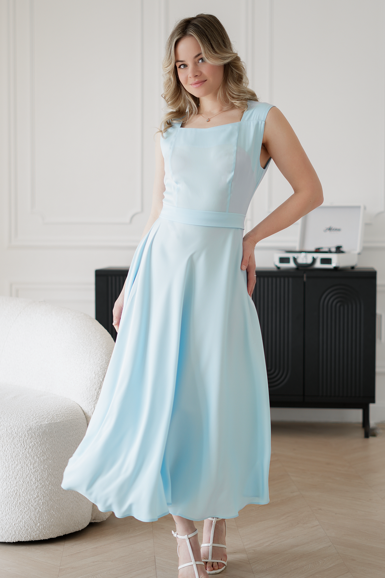 Duboki kvadratni izrez naglašava ramena i ključne kosti, prizivajući dah vintage elegancije.