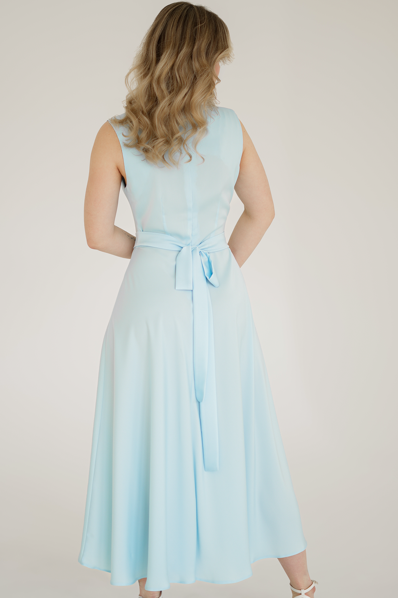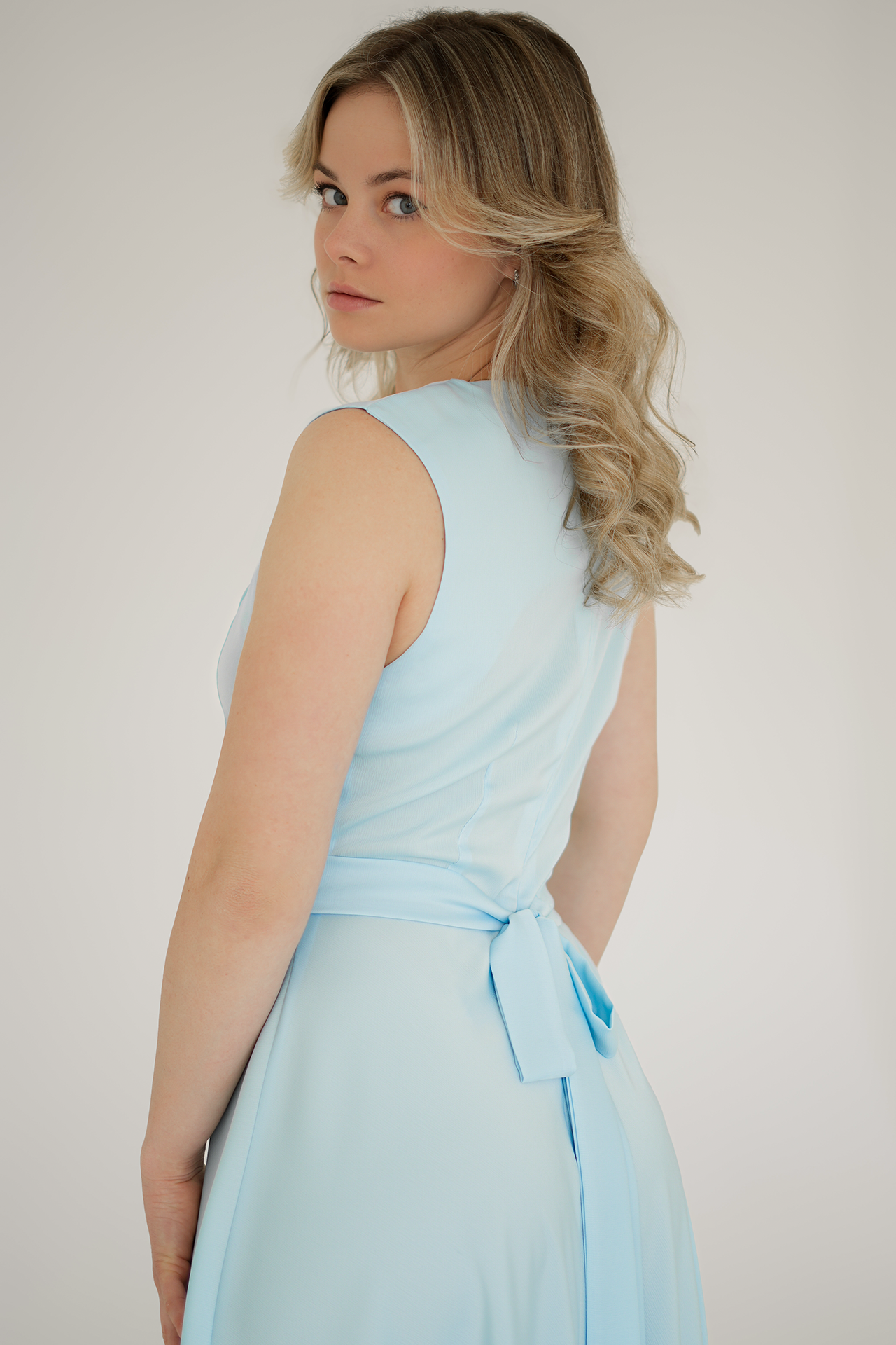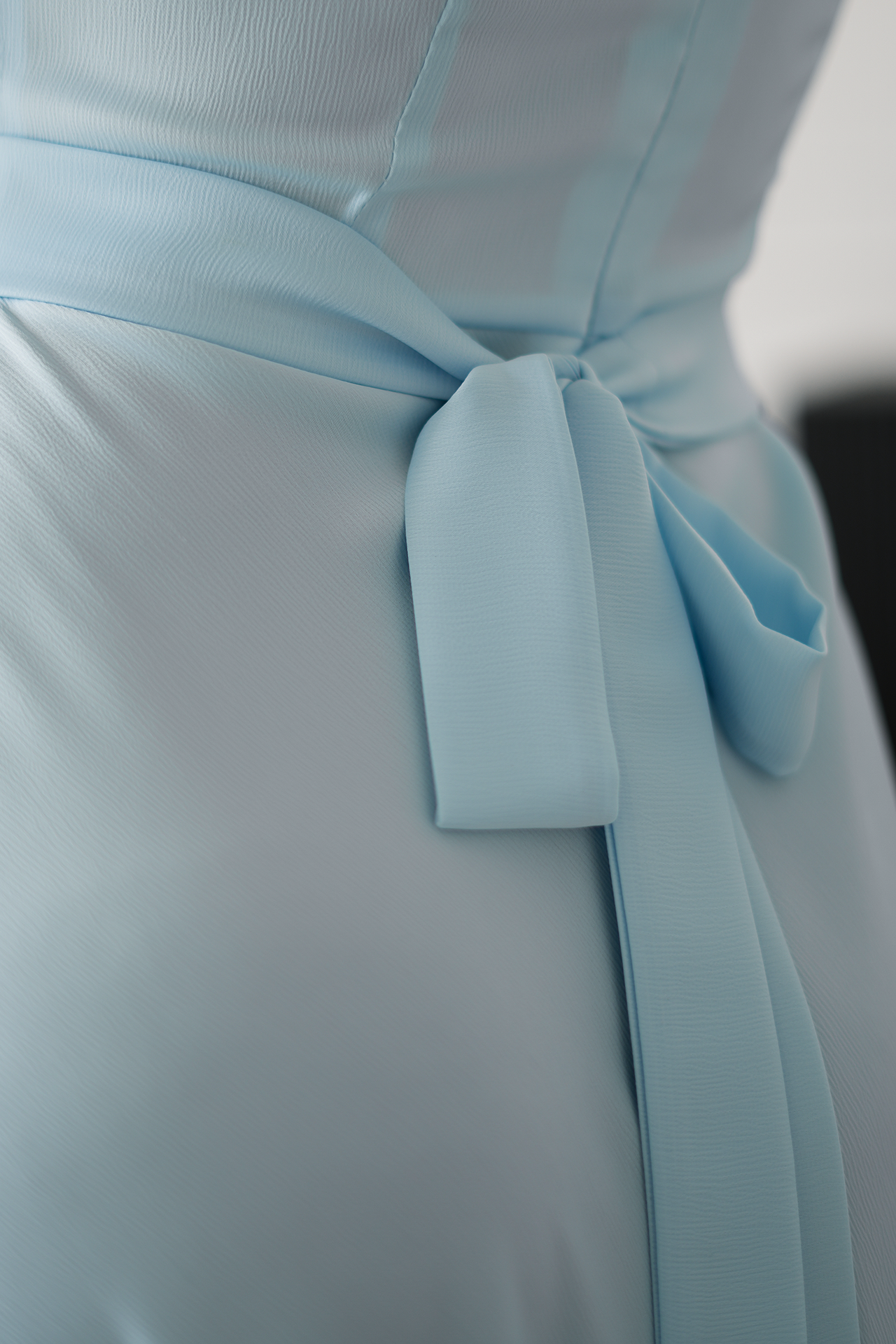 Pojas vezan straga lagano oblikuje siluetu — ostavljajući prostor za slobodu i dodir misterije.