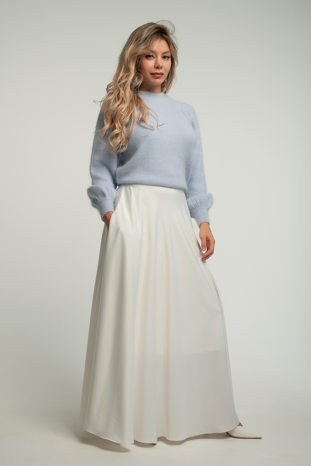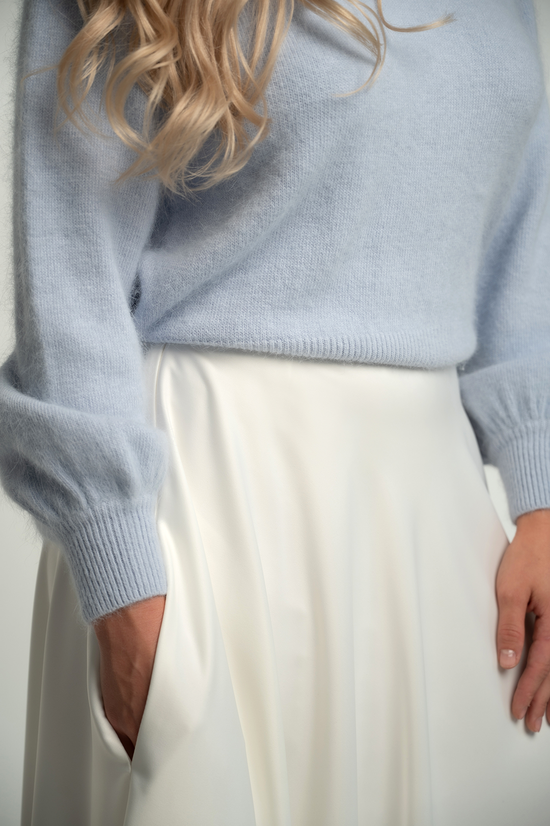 Nježna nebeskoplava nijansa evocira smirenost nakon oluje - profinjena, bezvremenska i ležerno ženstvena. Savršeno uparen sa svilenim suknjama ili krojenim hlačama, ovaj džemper postaje izjava smirenosti i samopouzdanja.