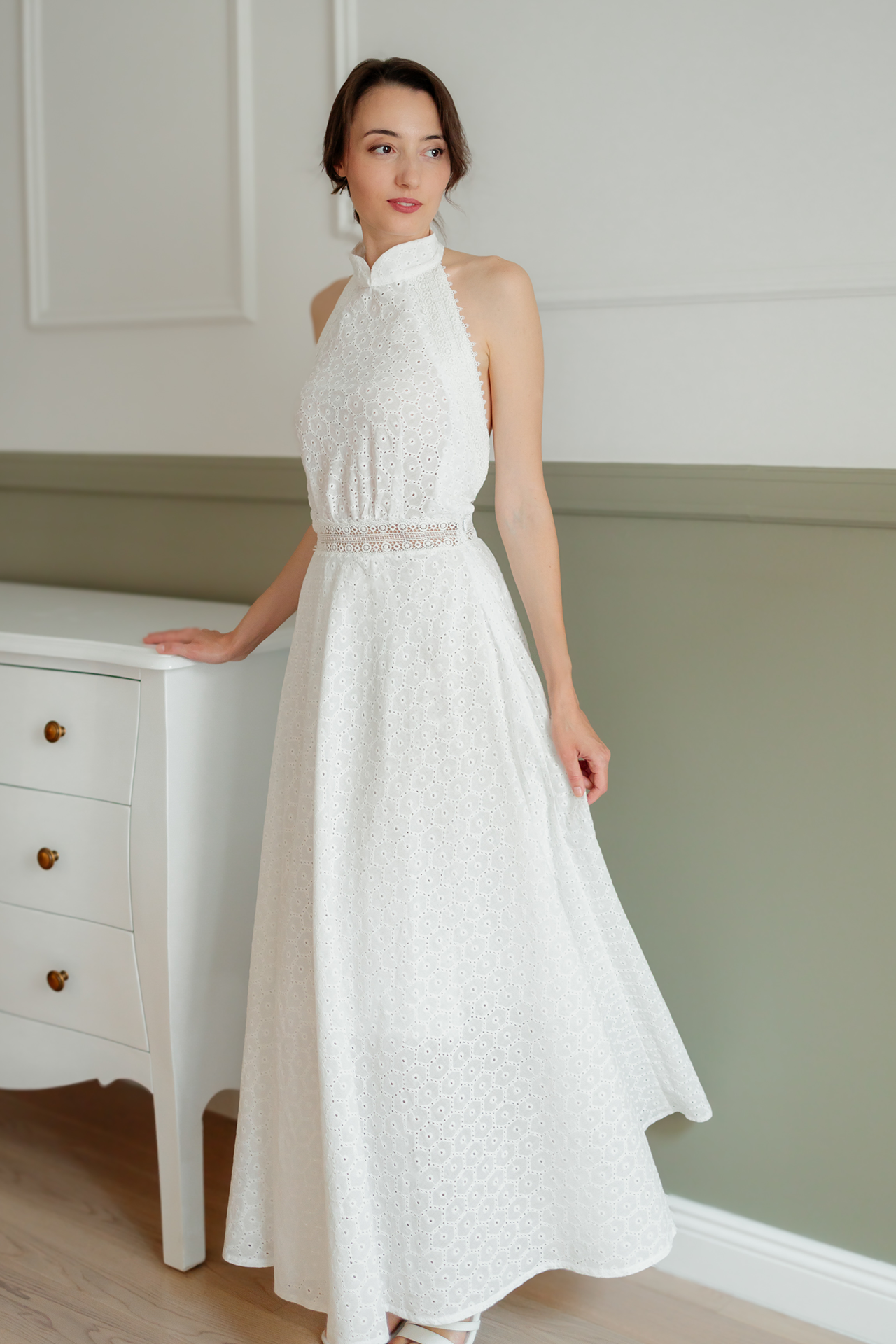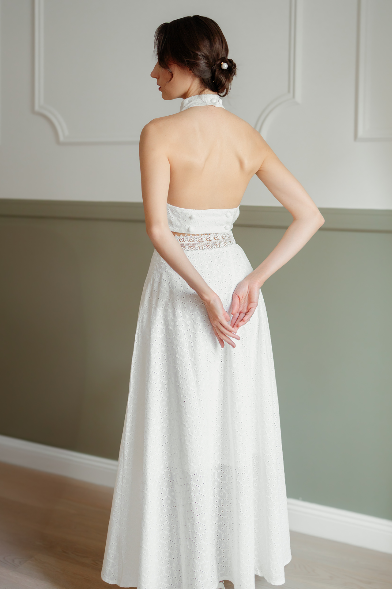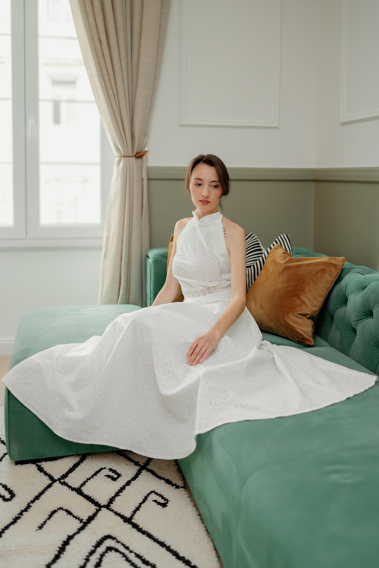 Izrađena od nježnog vezenog pamuka, djeluje kao da je istkana od sunčeve svjetlosti. Uski gornji dio nježno naglašava struk, dok lepršava suknja kreće se s gracioznom lakoćom. Visoki moderni ovratnik dodaje sofisticiranost, a otvorena leđa s prozirnim čipkastim pojasom donose suptilan dodir romantike i smjelosti.