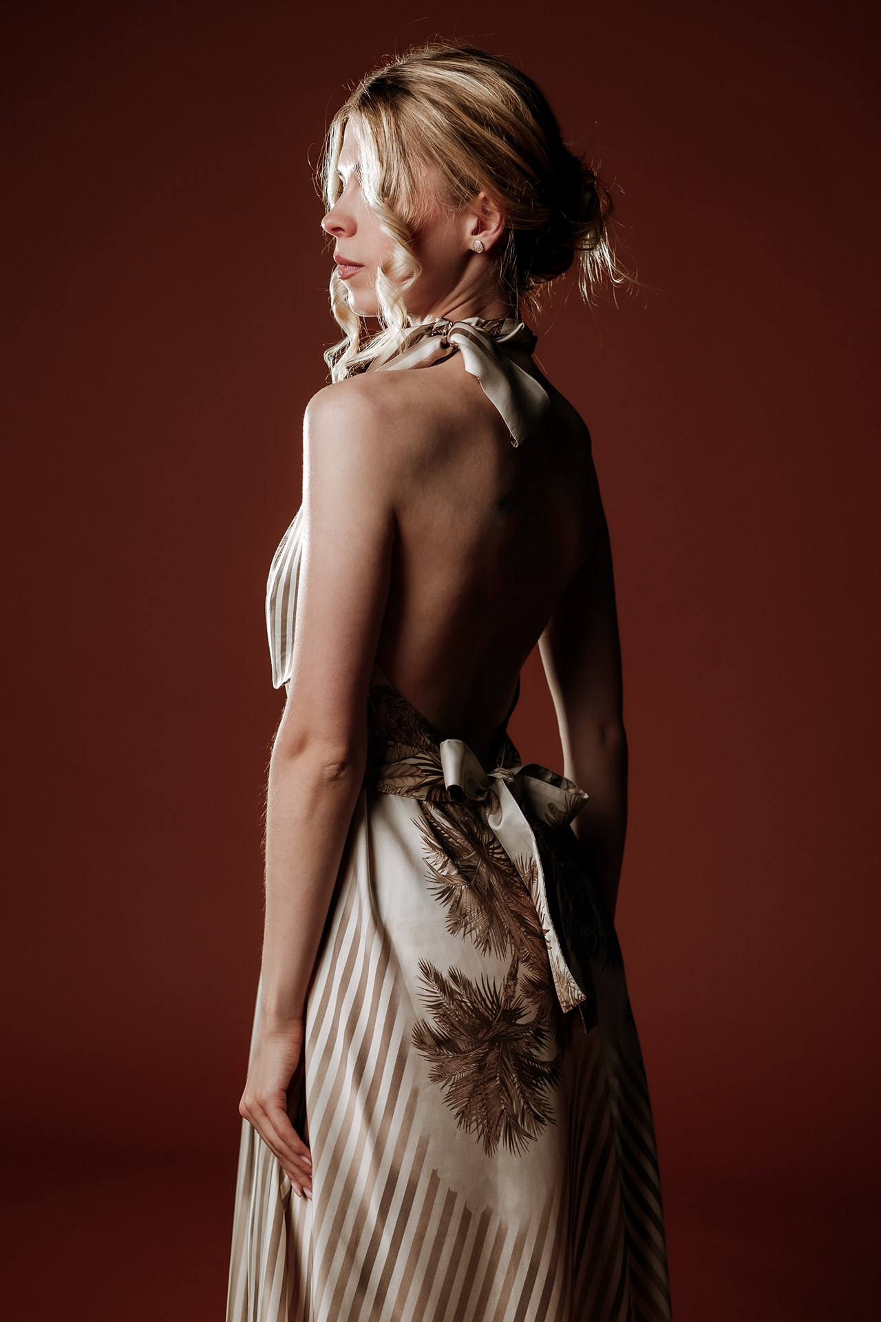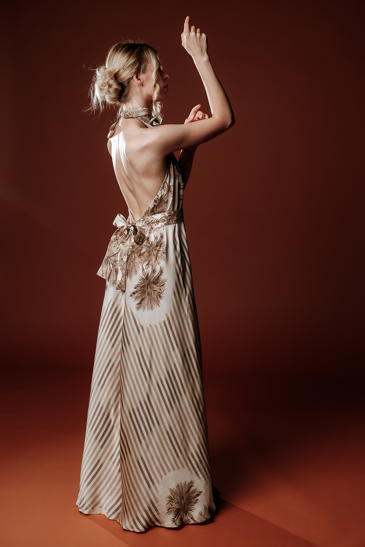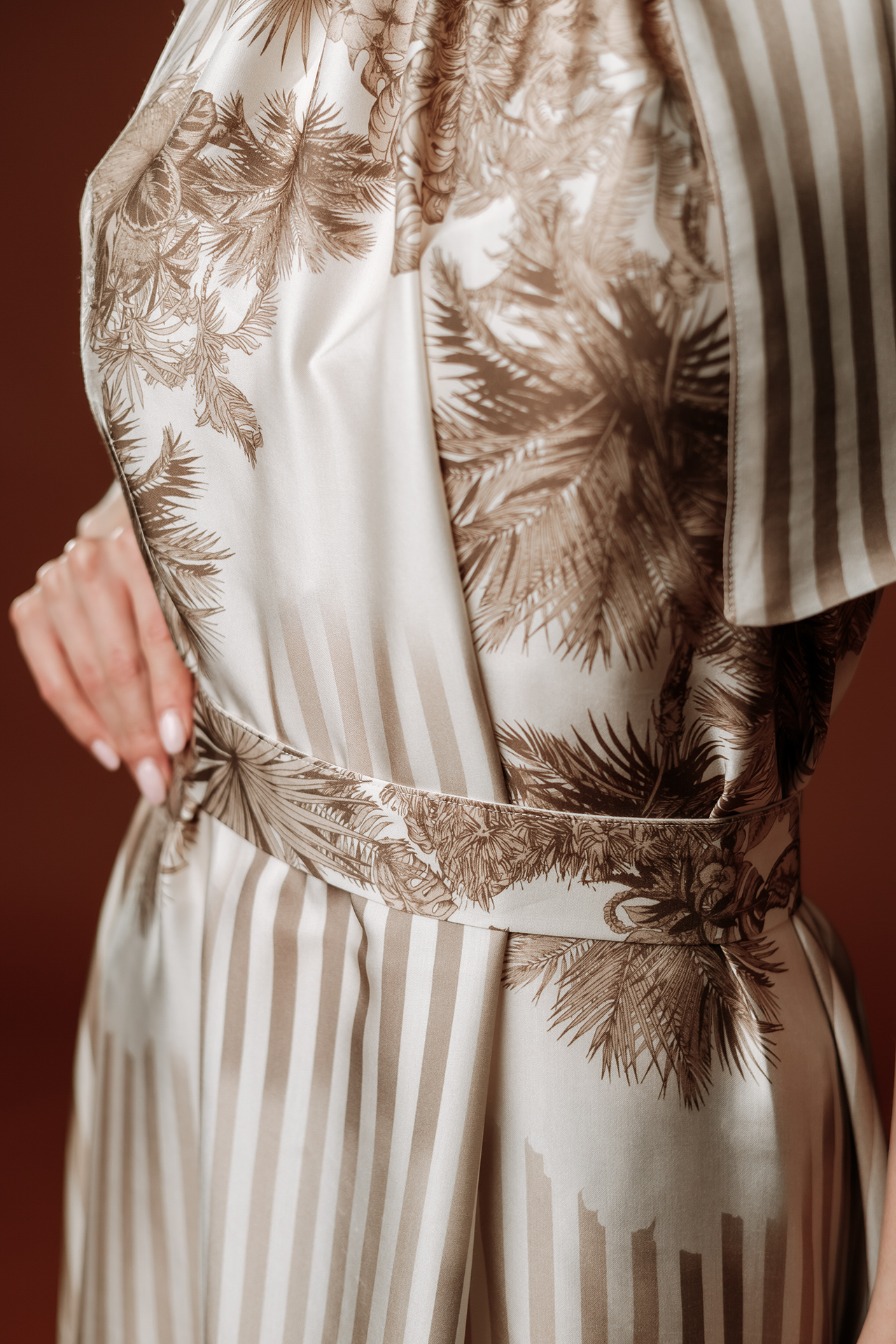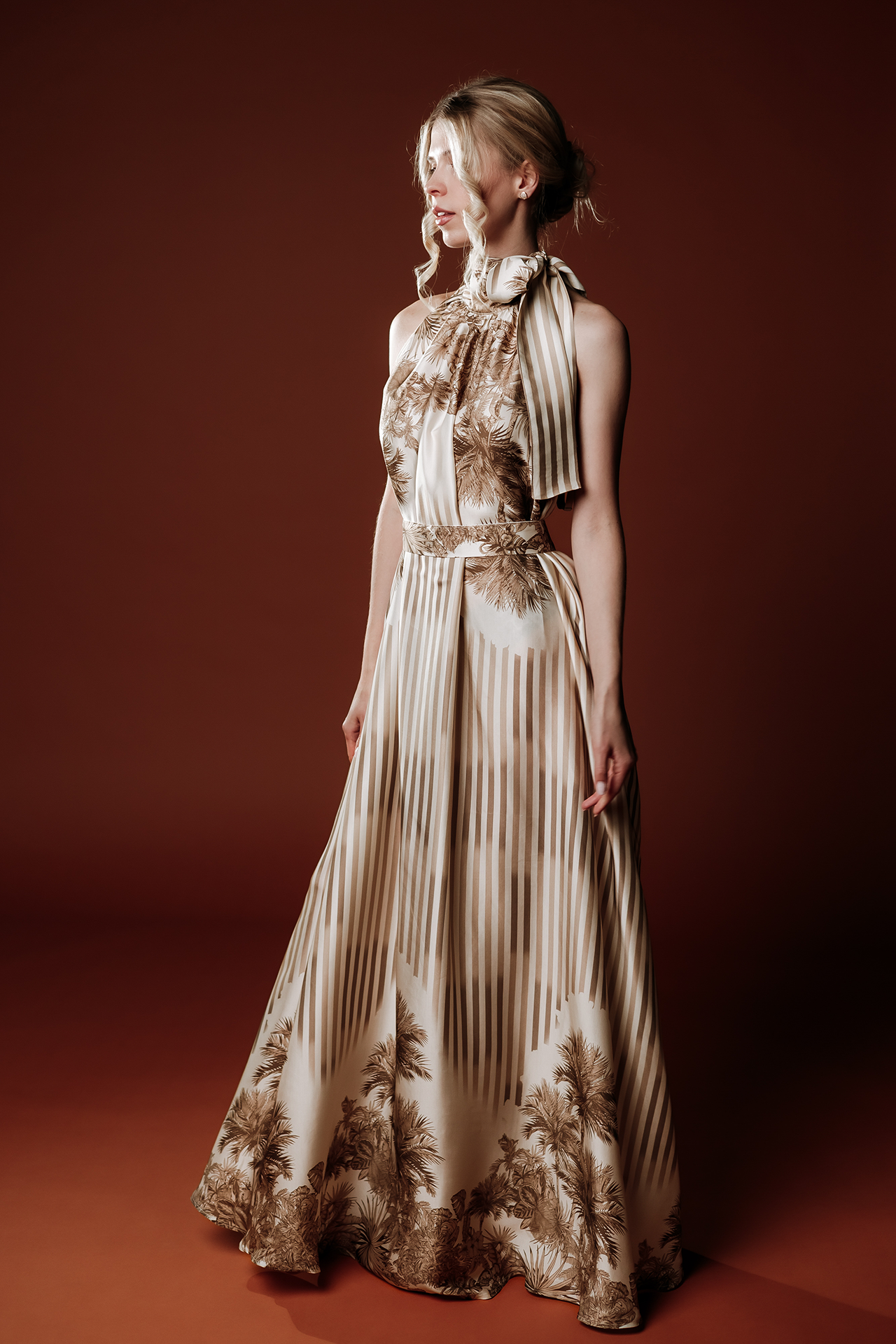 Ljetna haljina izrađena od lepršave svile s ekskluzivnim printom palmi i pruga - utjelovljenje profinjene ženstvenosti. Ovaj model s halter izrezom ima otvorena ramena, vezan je oko vrata i stegnut u struku pojasom. Njezina opuštena silueta i maksimalna duljina naglašavaju lakoću i fluidnost, što je čini savršenom za odmor na moru ili posebne prigode. Nježni puderasto-bež tonovi printa dodaju osjećaj gracioznosti i decentnog luksuza.