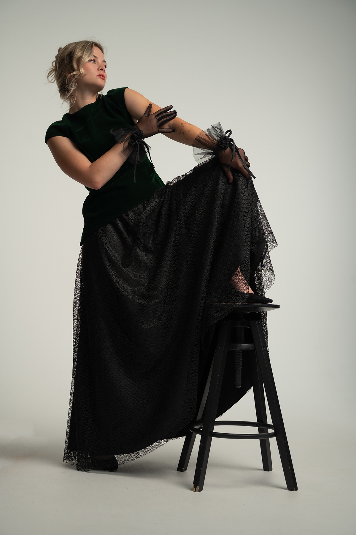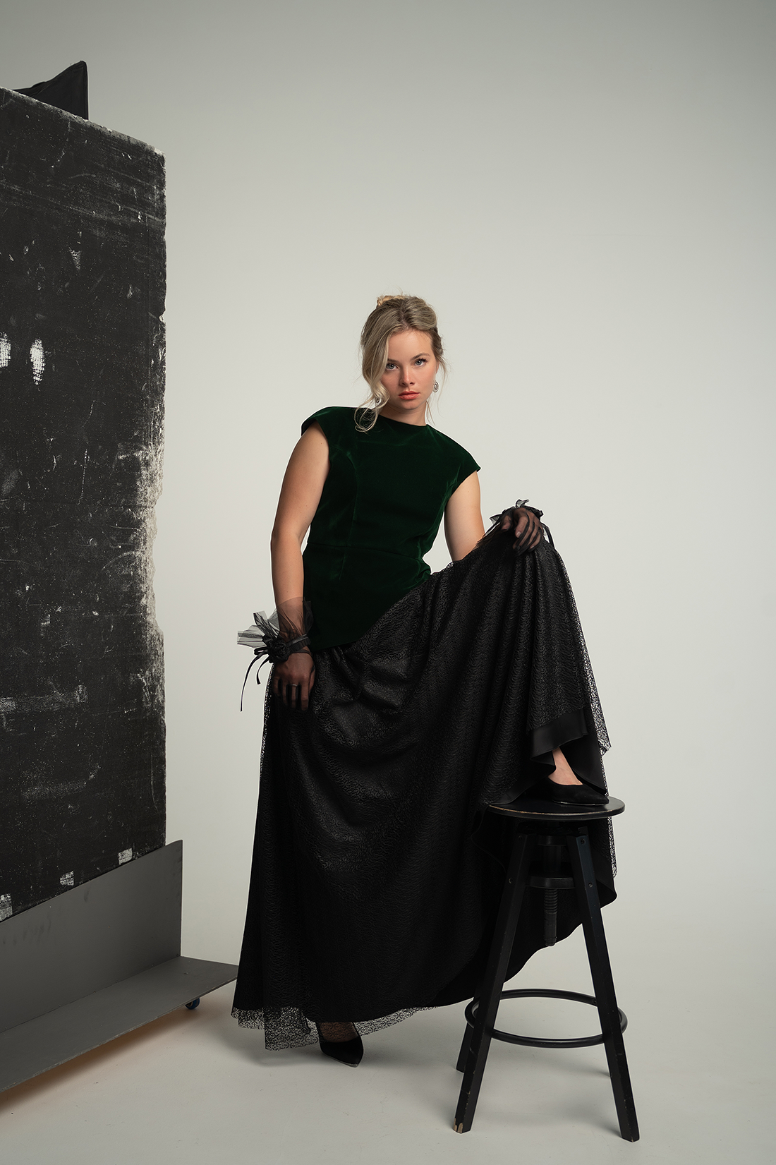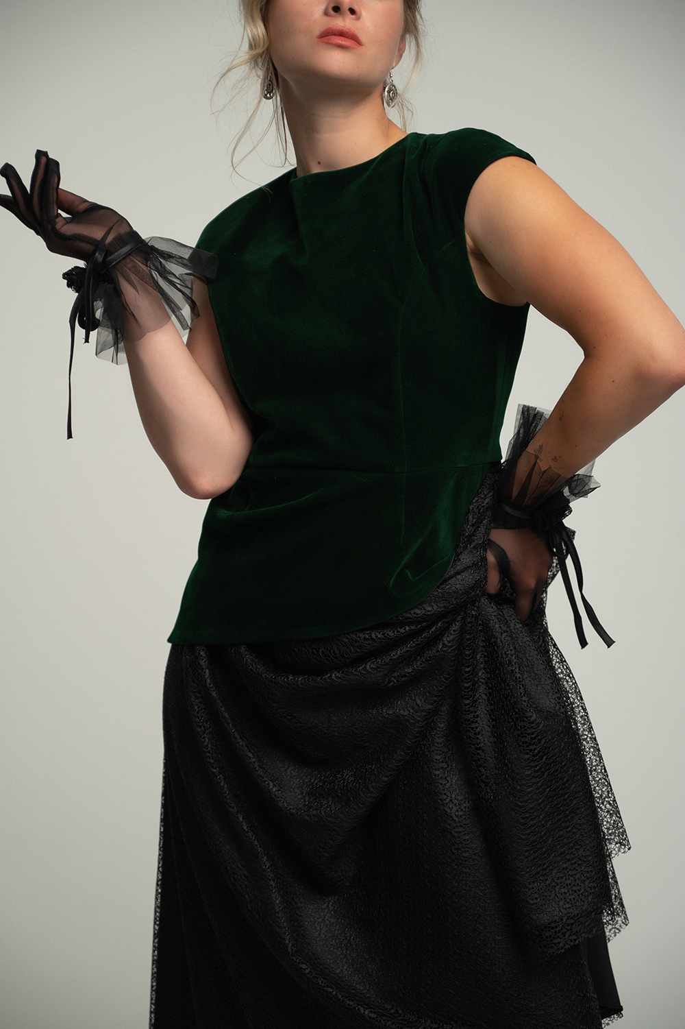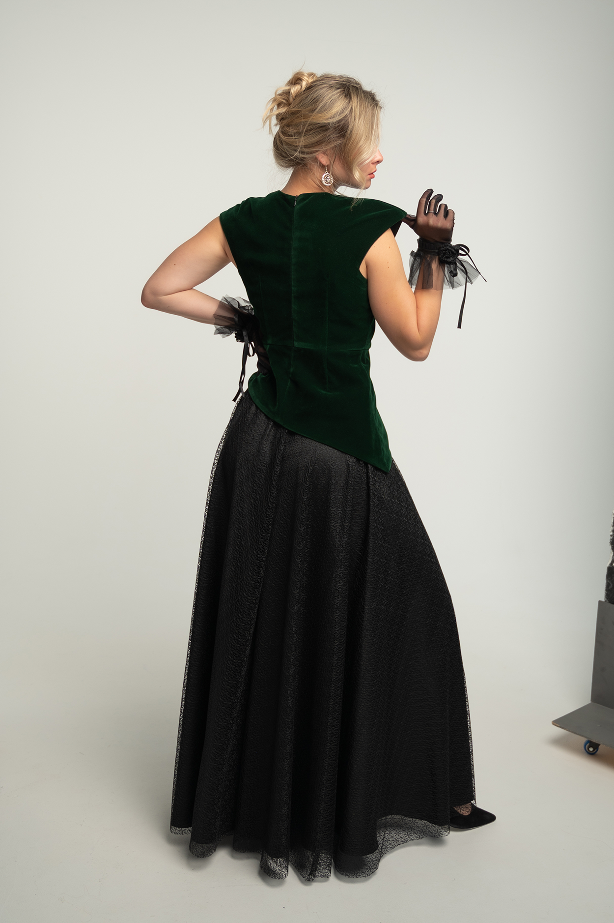 Set Forest Jade kombinira strukturirani smaragdni baršunasti top s lepršavom crnom suknjom izrađenom od teksturirane lagane tkanine.