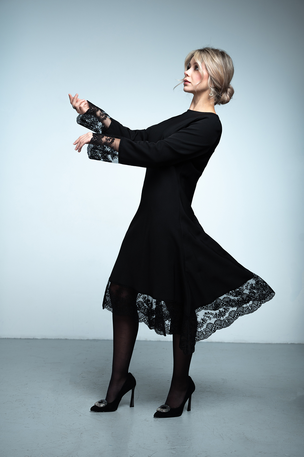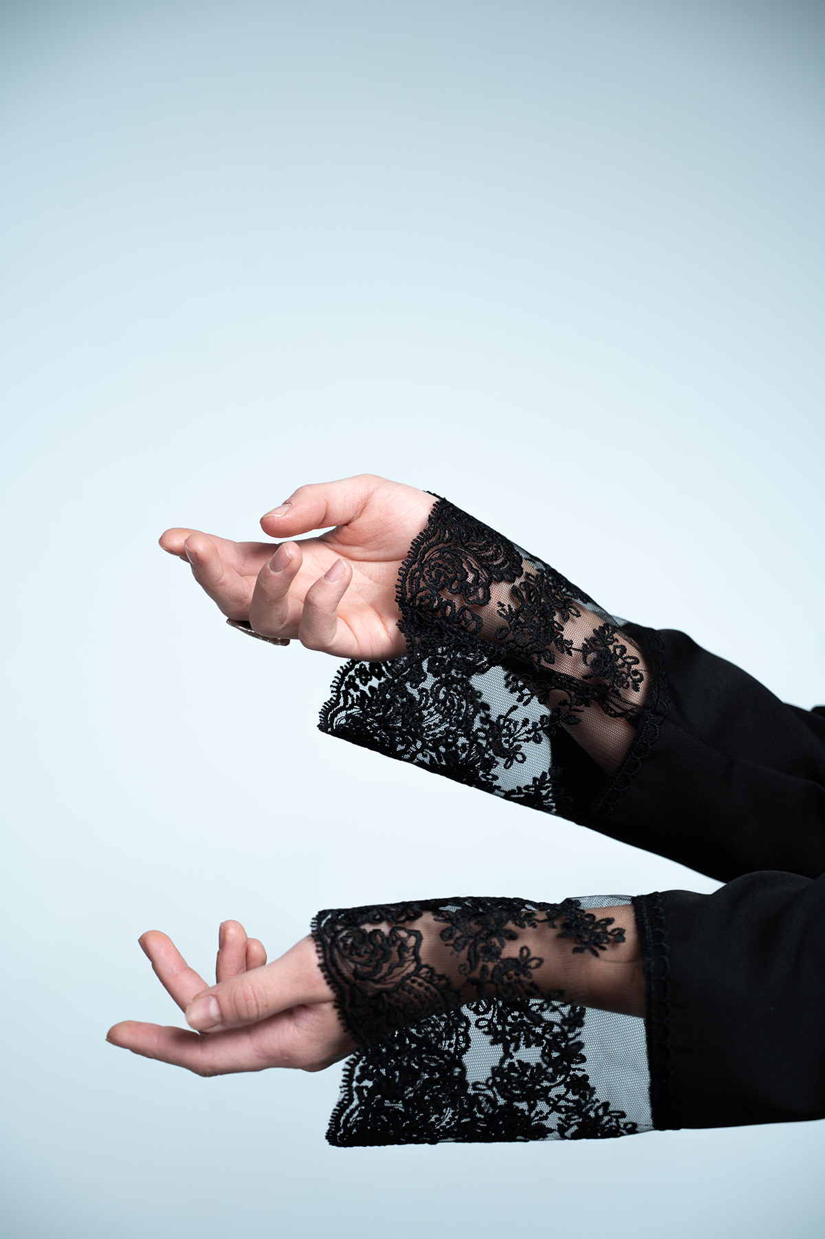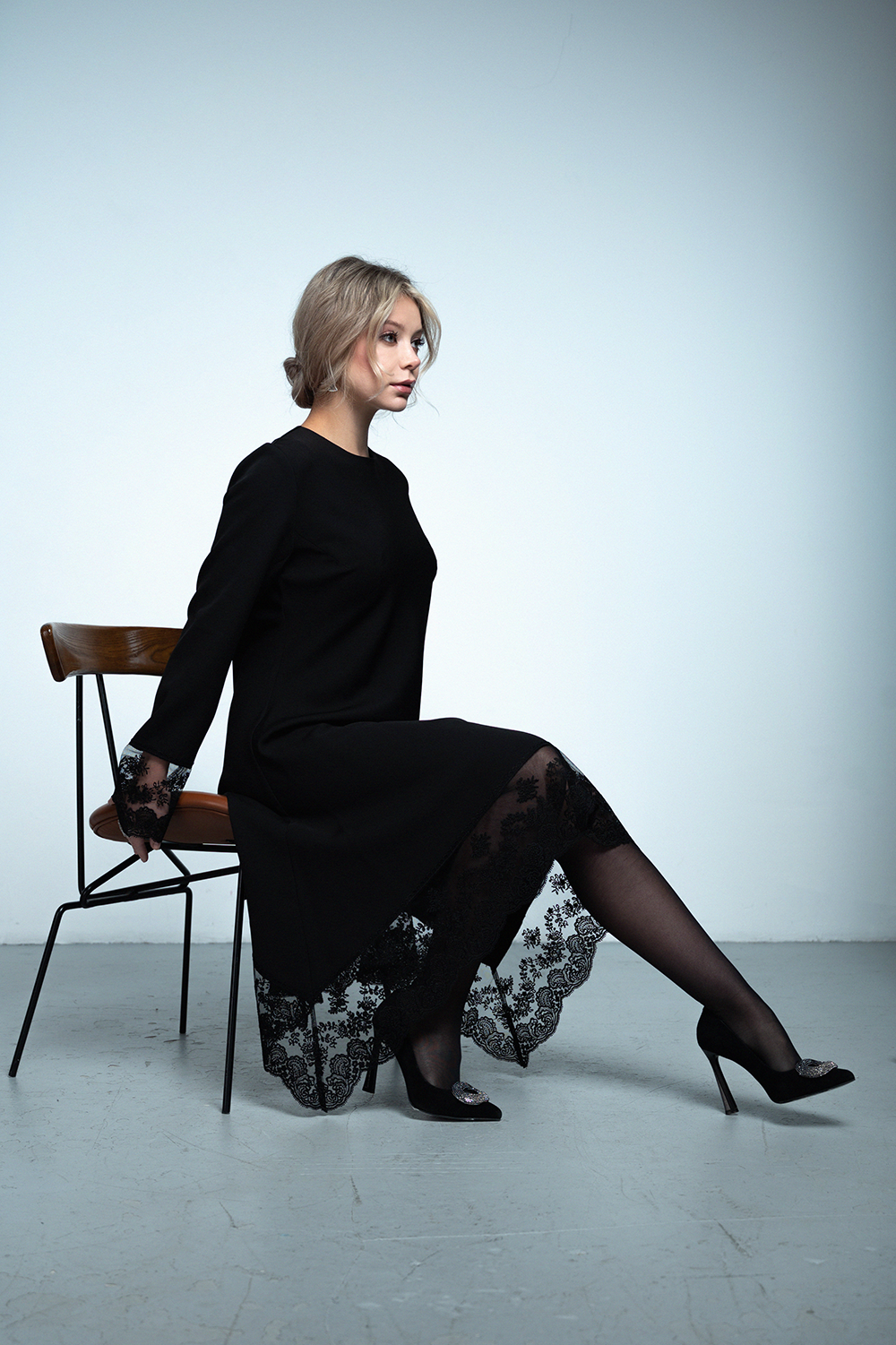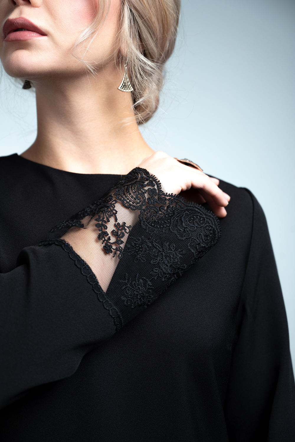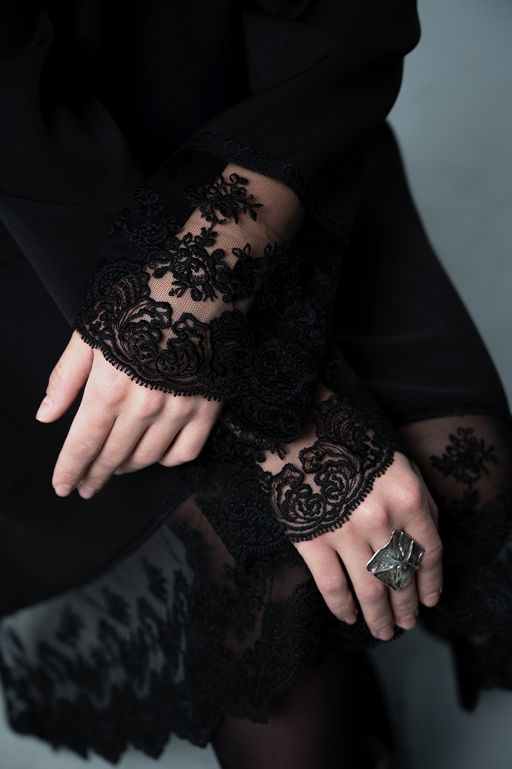 Silueta prirodno teče s tijelom, nježno naglašavajući struk i stvarajući lagano kretanje sa svakim korakom. Čipkom obrubljeni rub i manžete dodaju dubinu i ženstvenost, otkrivajući taman toliko da izgled ostane intrigantan, a opet sofisticiran.