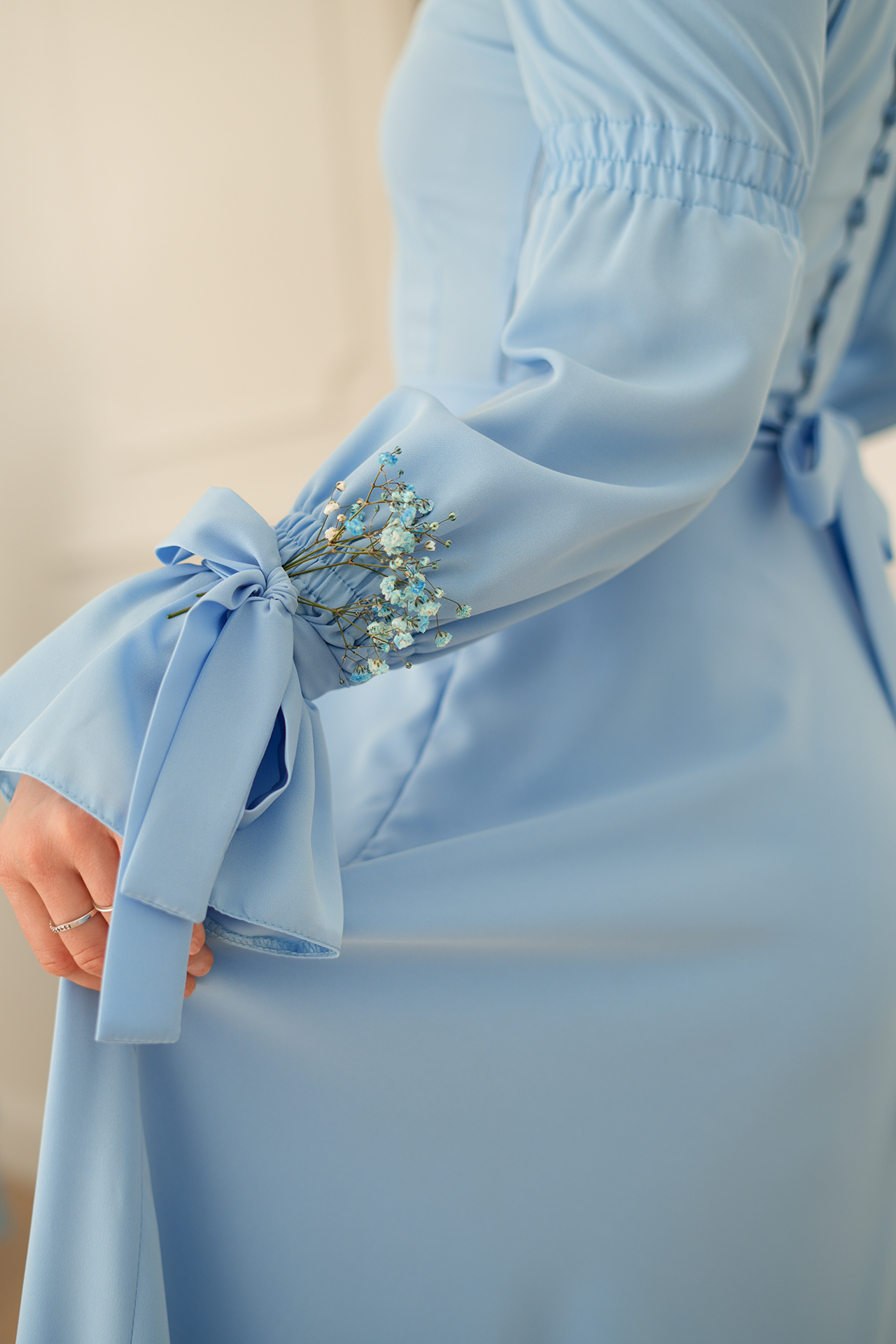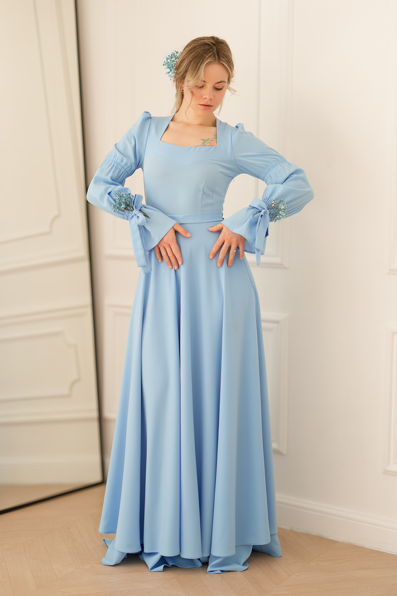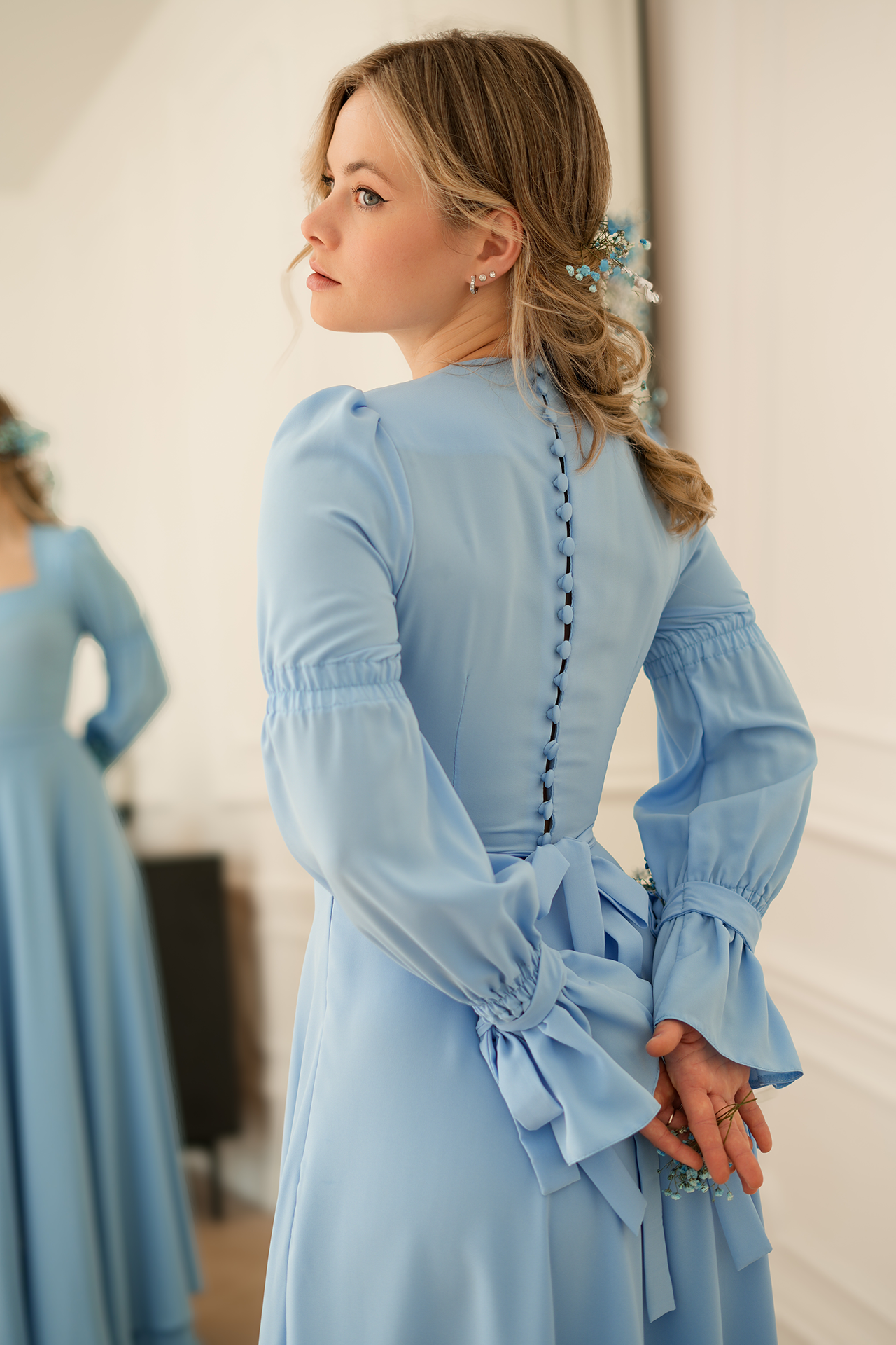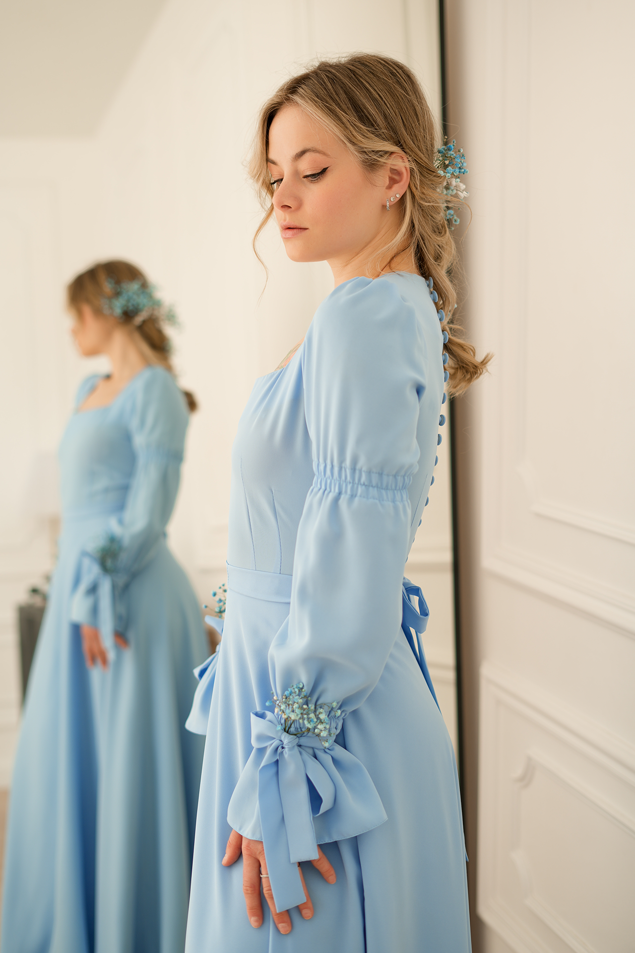 Haljina poput povjetarca s brda i slanog daha mora. Silueta s četvrtastim izrezom i mekim naborima kao da nosi šapat šume i tišinu valova. Čipkana leđa i voluminozni rukavi dodaju eleganciju inspiriranu skladom prirode. Stvorena za one koji osjećaju ljepotu u svakom pokretu.