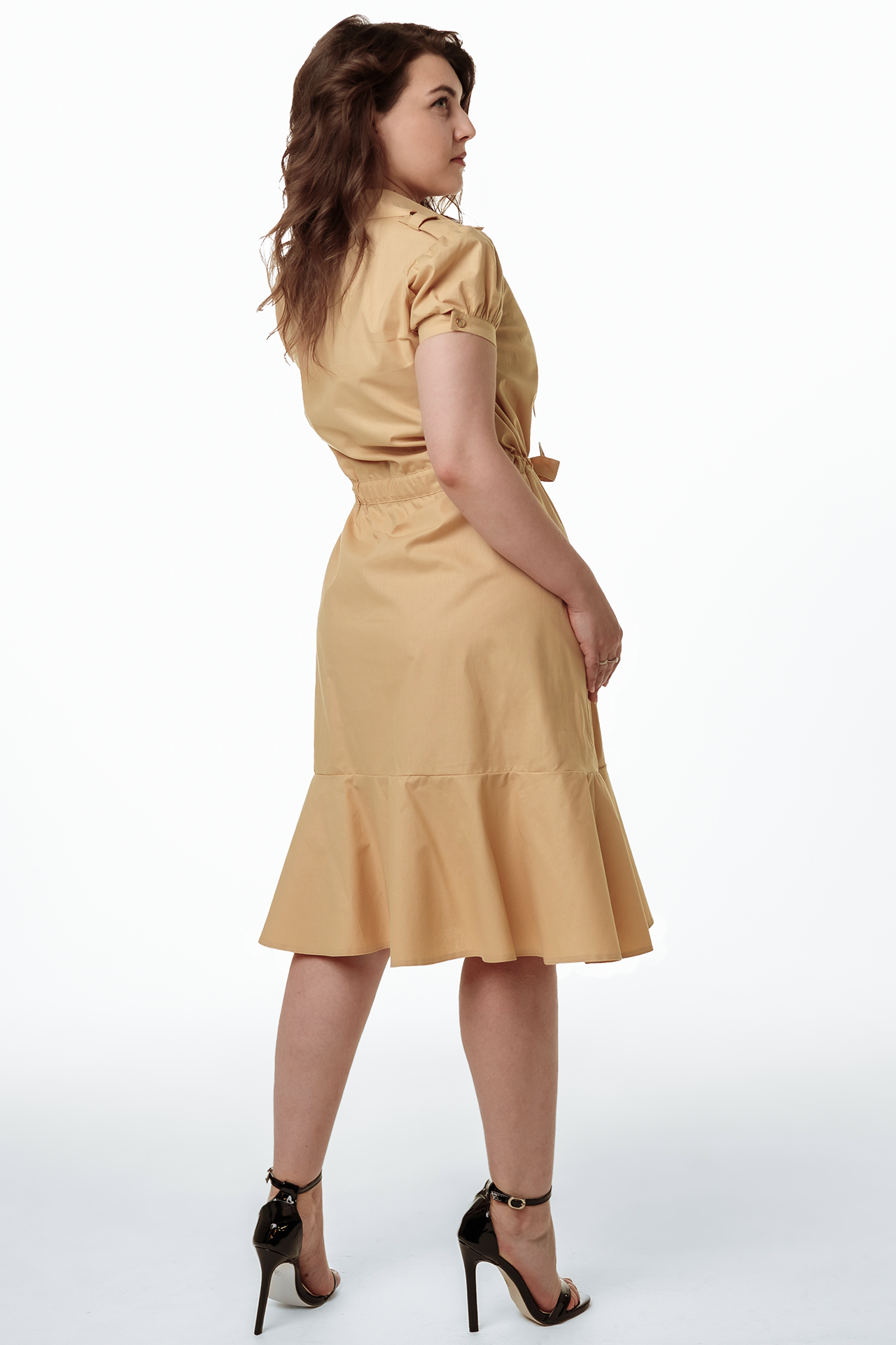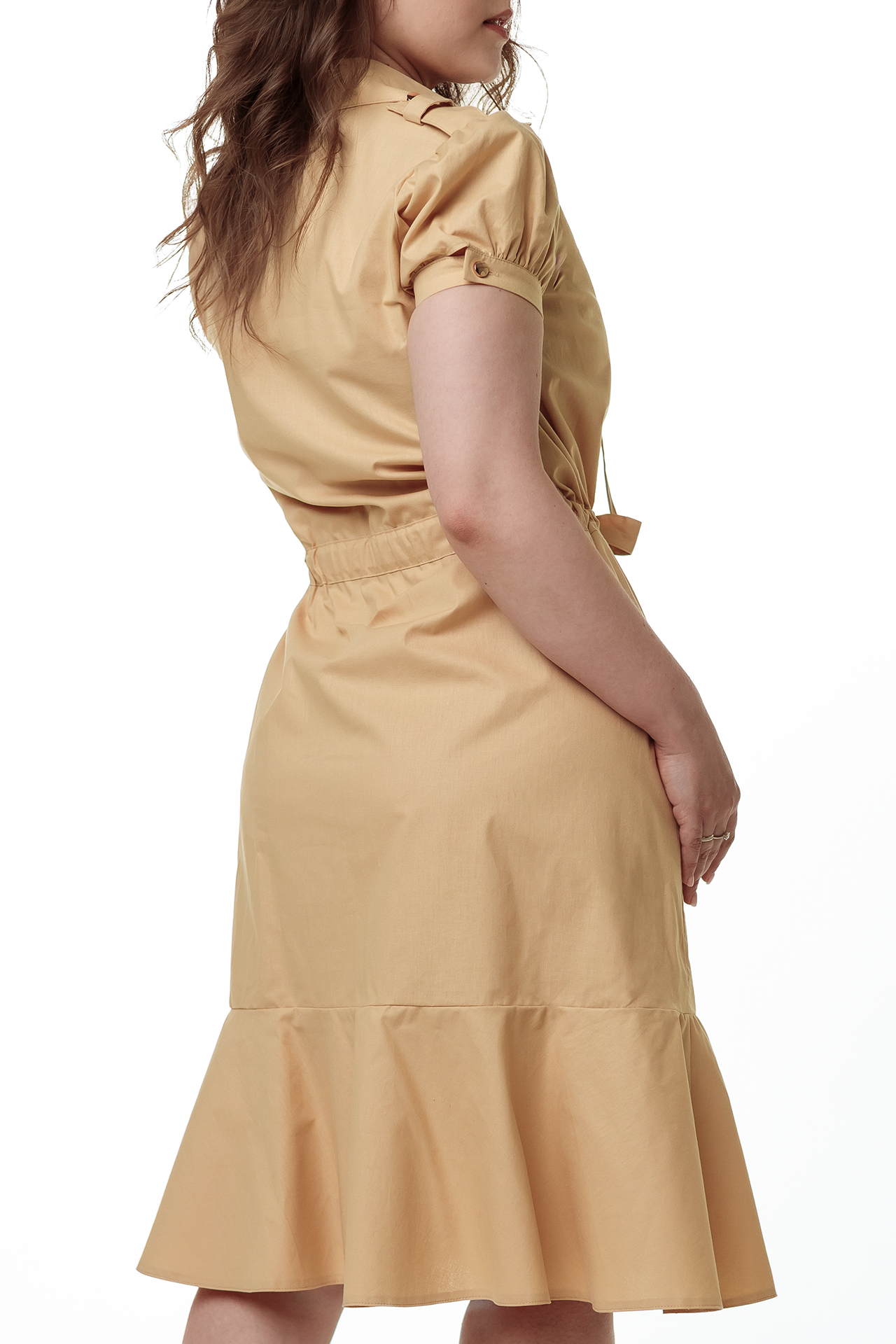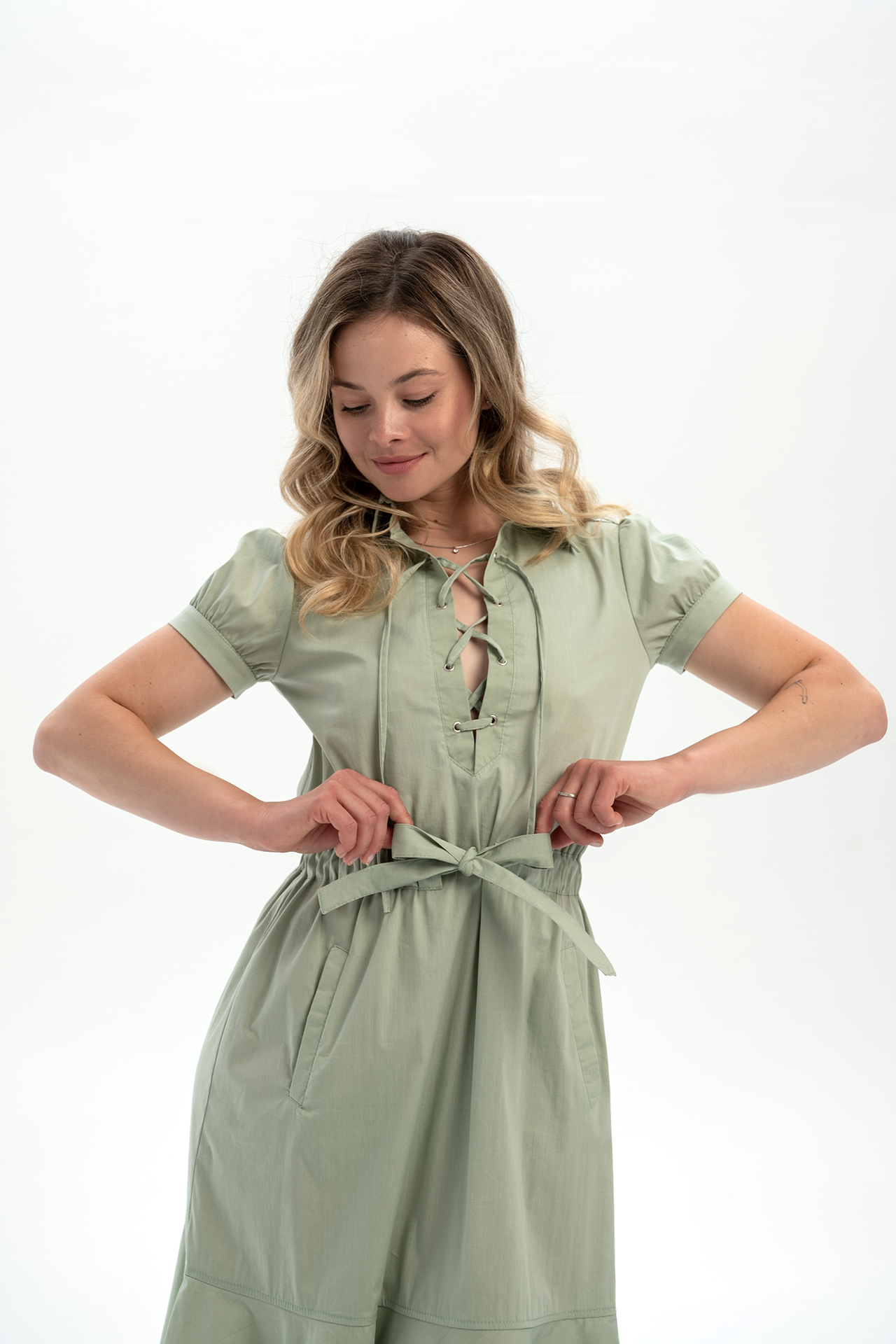 Elegantna košulja-haljina od pamuka s istaknutim strukom i razigranim volanima na rubu. Kratki balon rukavi i V-izrez s vezicama dodaju poseban šarm. Zahvaljujući prirodnom pamuku, savršen je izbor za ljetni look, osiguravajući udobnost i lagodnost u toplom vremenu.
